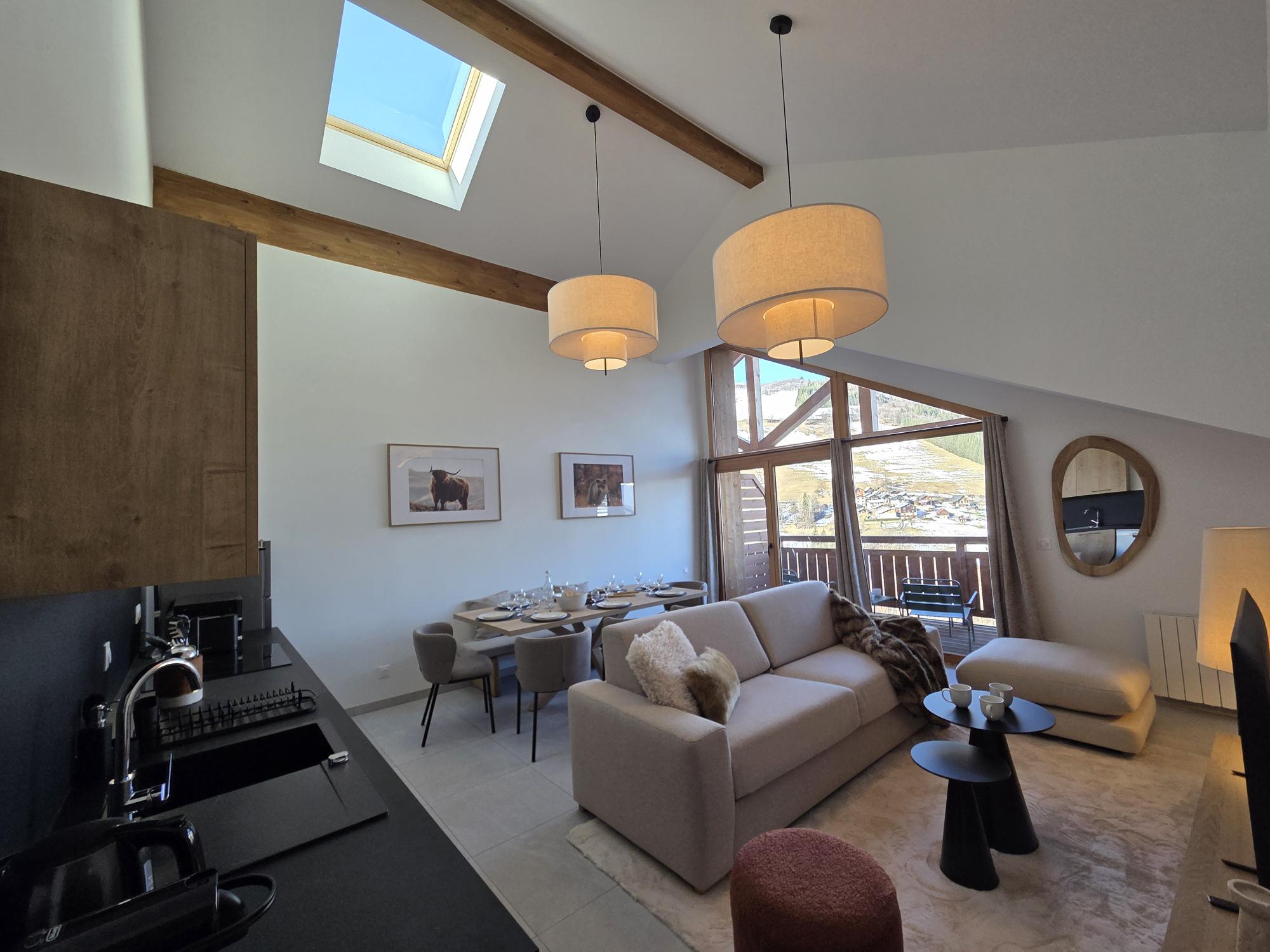 Trois pièces + cabine au 2ème et dernier étage de la résidence,n°25 au plan, orienté Nord, surface Carrez 69m²45, surface balcons 18m²13. Composé de : entrée avec rangements, dégagement, wc, salle de bains, couloir desservant la première chambre et la cabine donnant accès au balcon de 12m²69, cuisine équipée ouverte sur la pièce principale et accès au balcon de 7m²20 orienté Nord et deuxième chambre en suite avec salle d'eau. En annexe casier à skis et deux emplacements de stationnement en sous-sol. Programme éligible à la récupération de TVA.