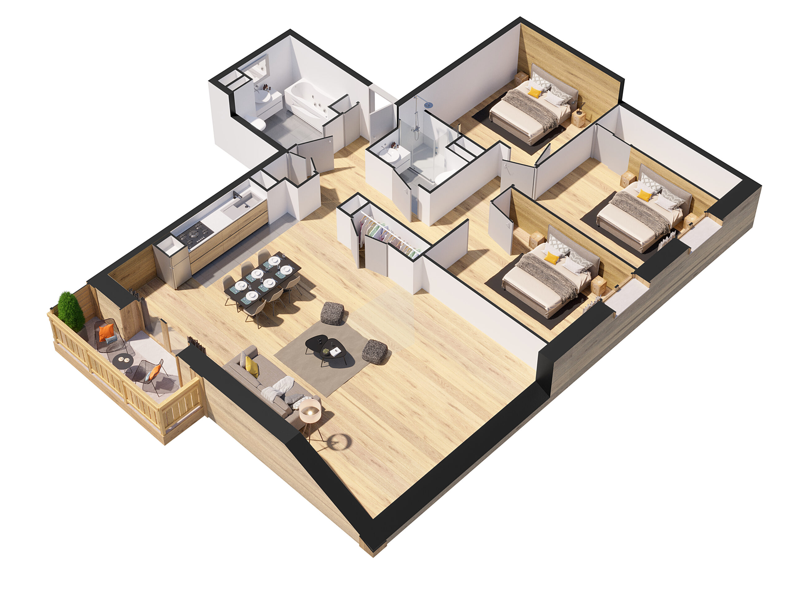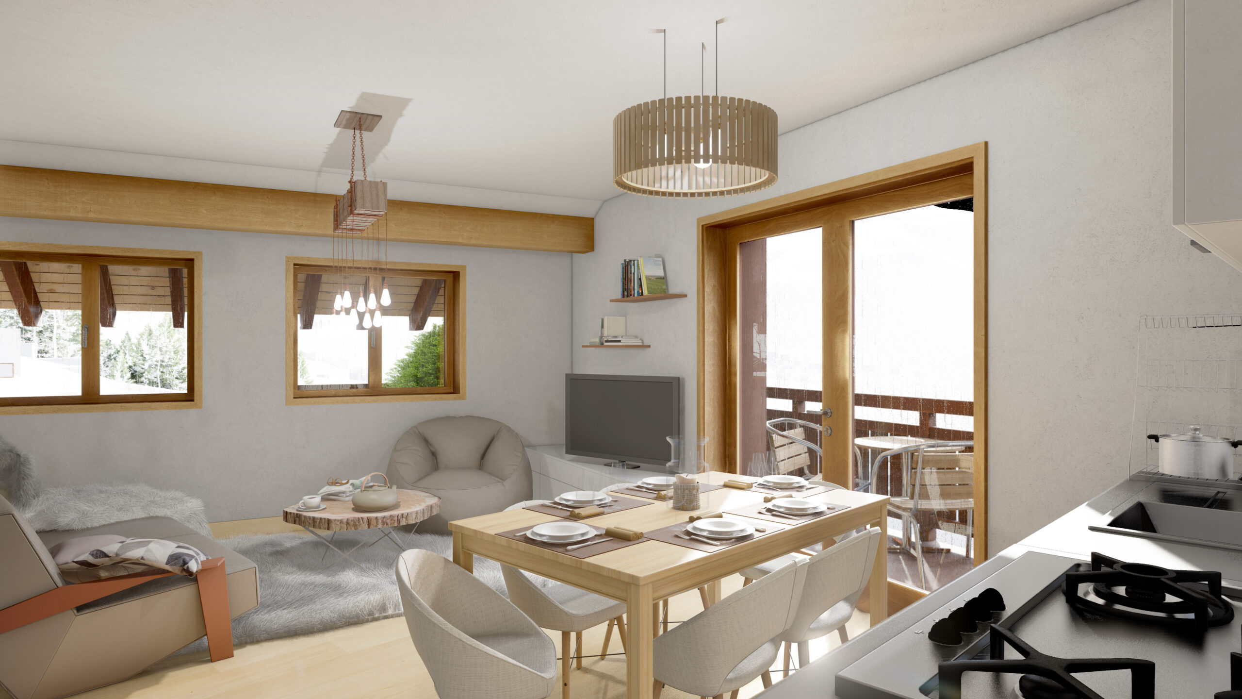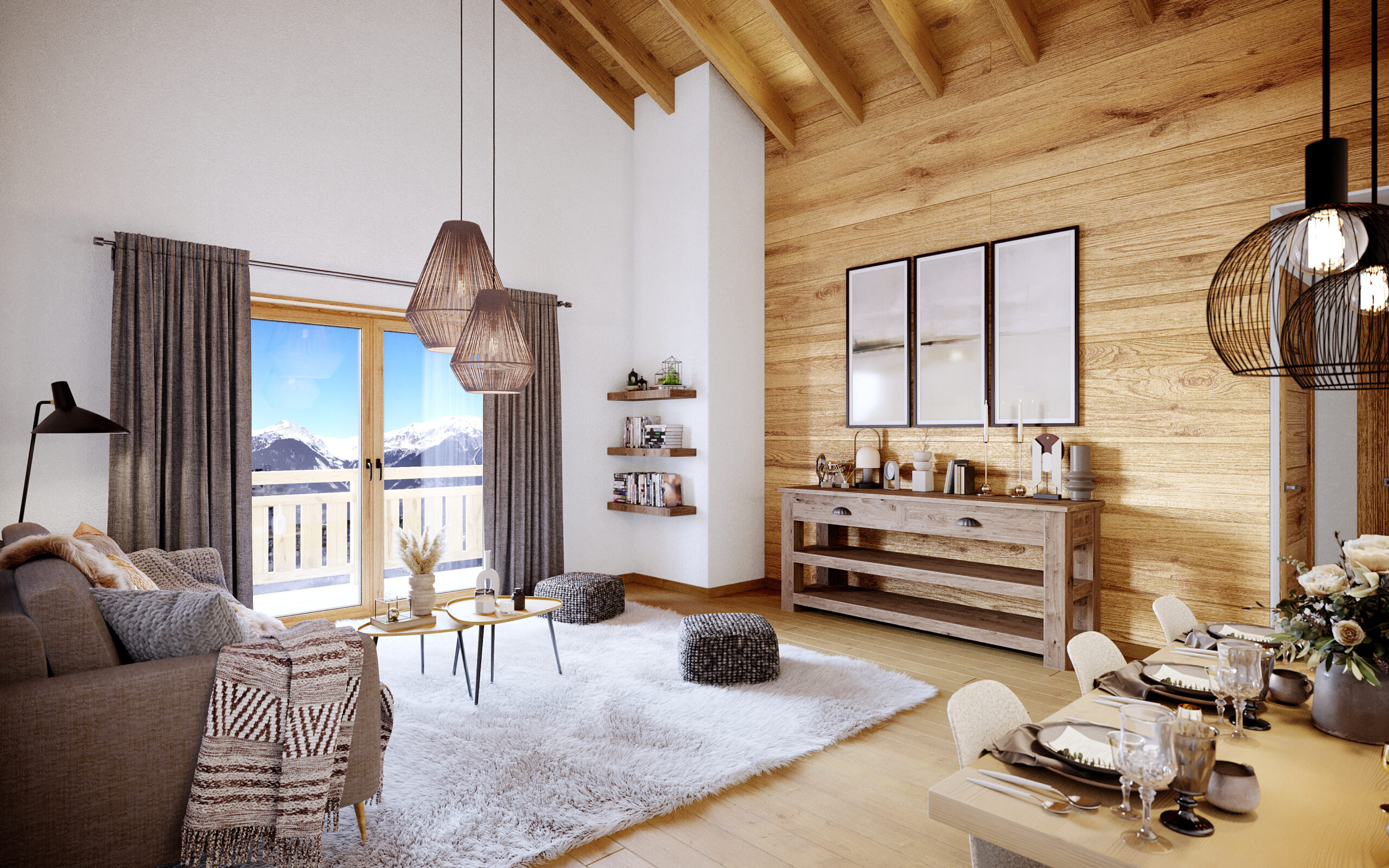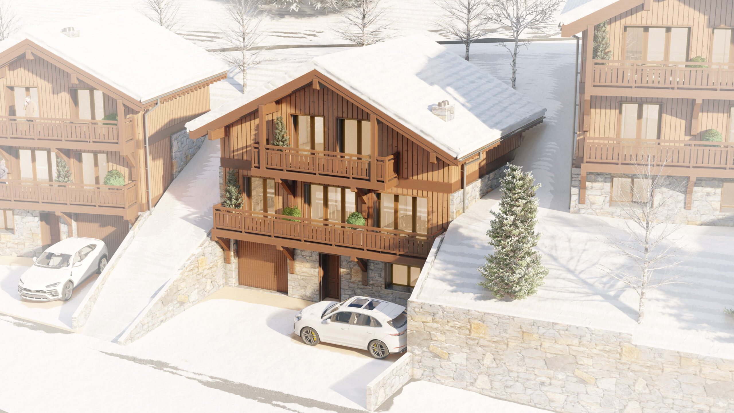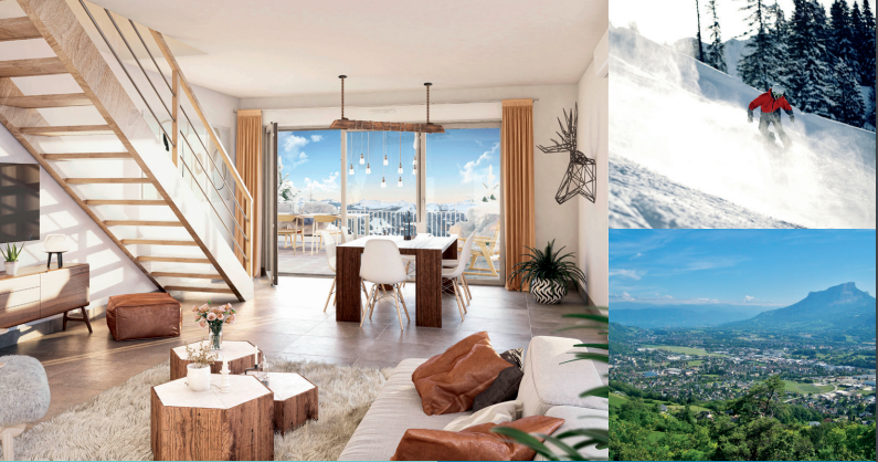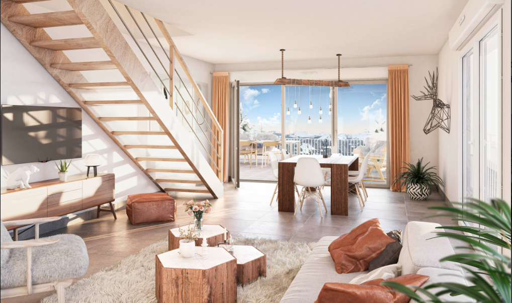Appartements du 3 Pièces au 5 Pièces Duplex à partir de 579 000 € vendus avec cuisine équipée, cave, ski room et emplacement de stationnement intérieur en sous-sol, accès direct par ascenseur.
