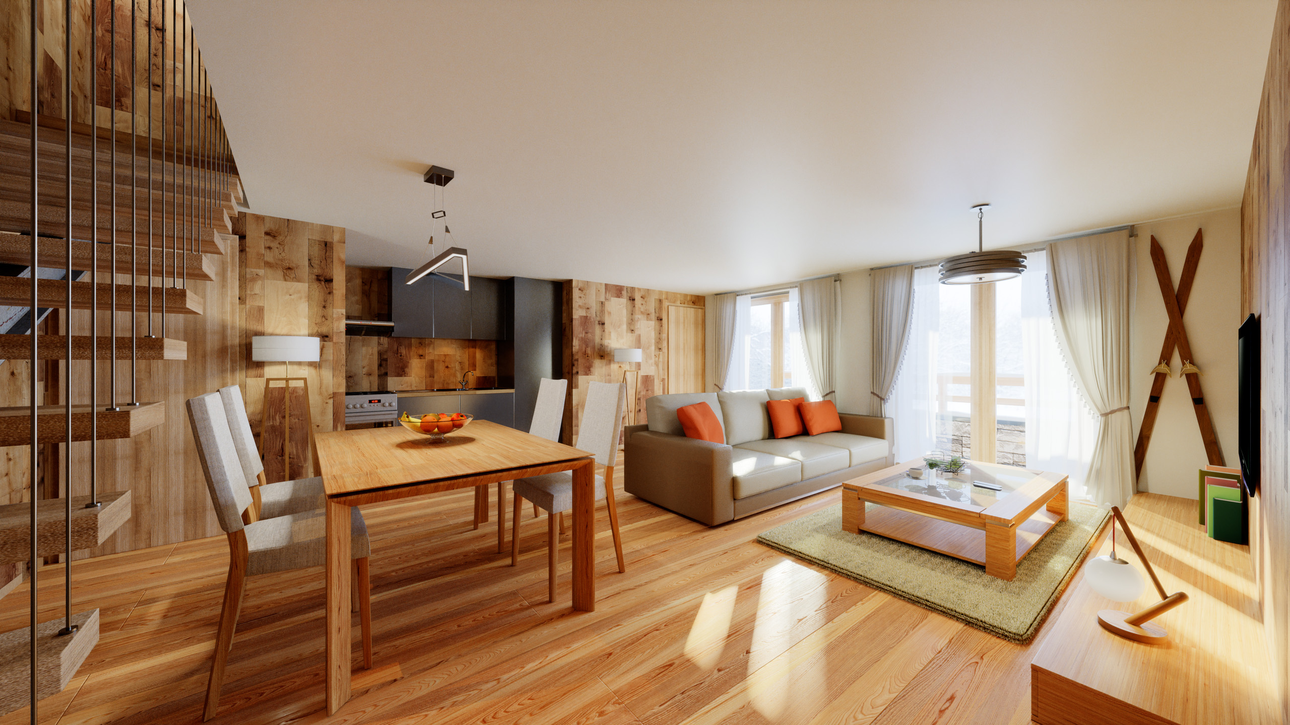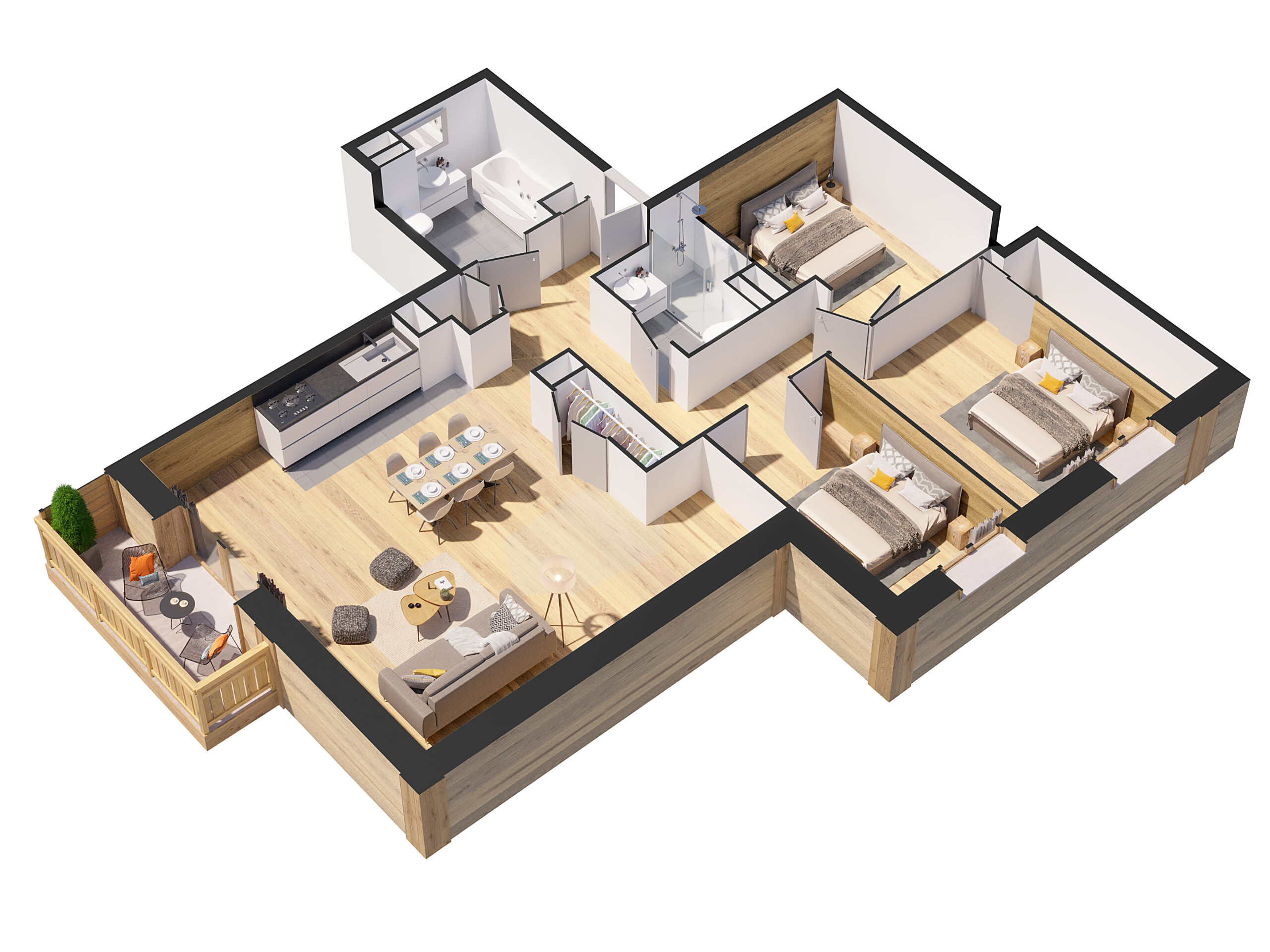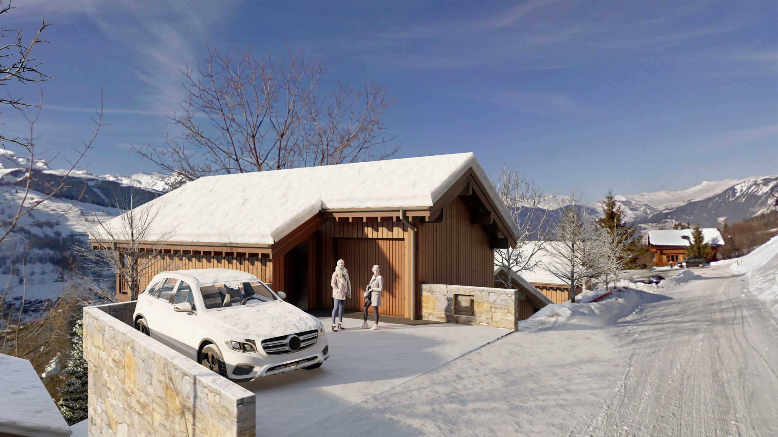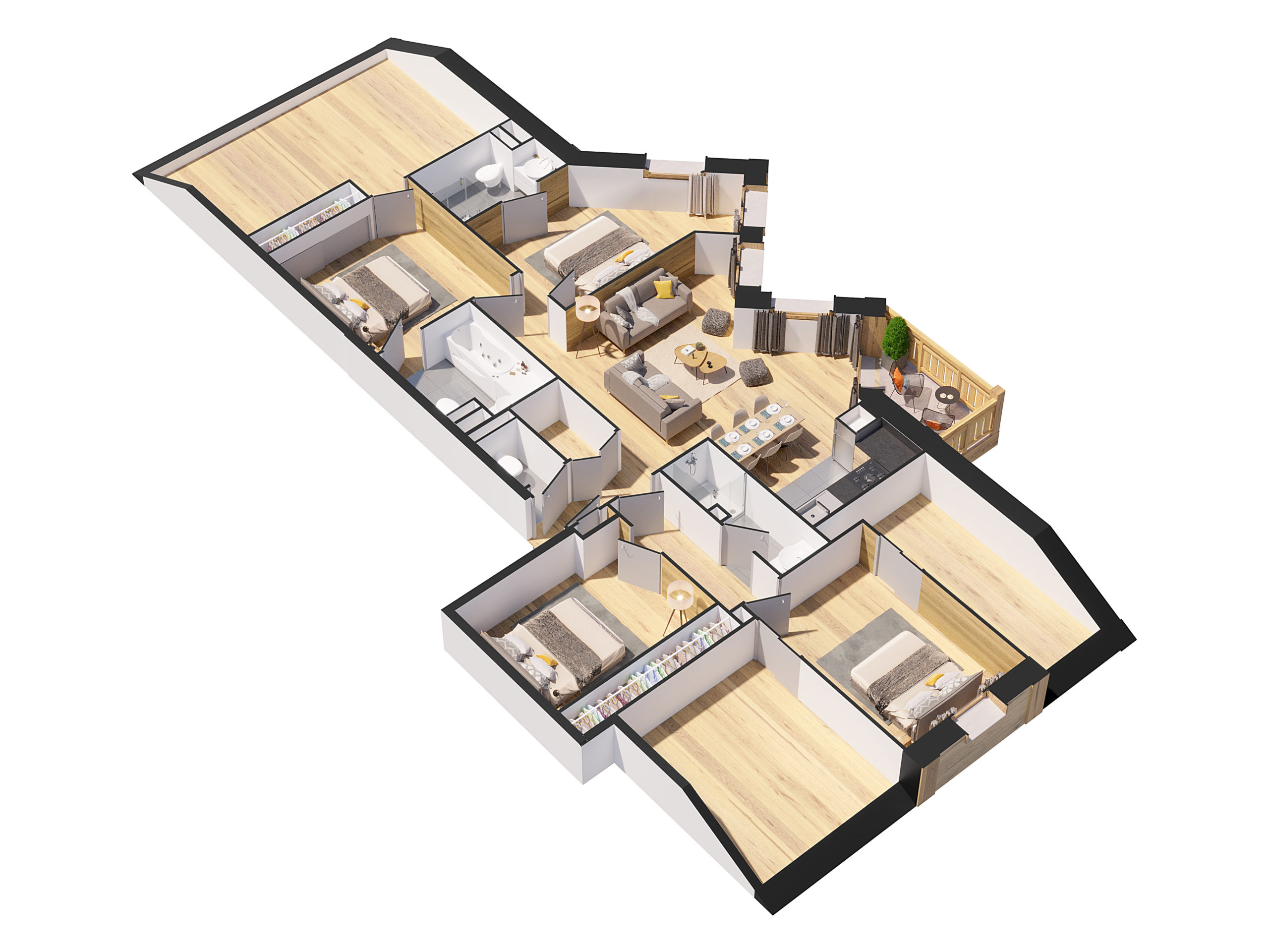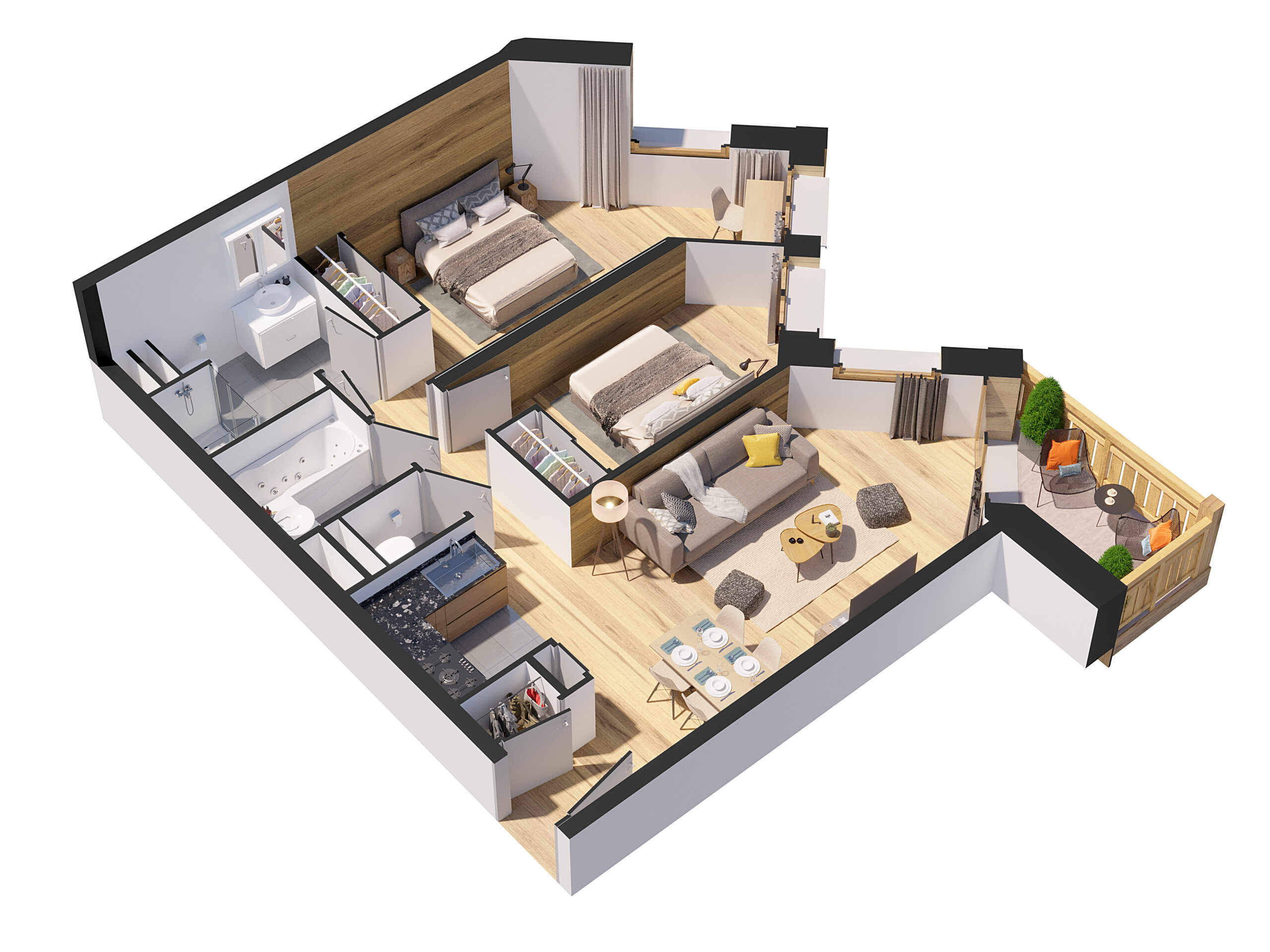 Appartements du 3 Pièces au 5 Pièces Duplex à partir de 579 000 € vendus avec cuisine équipée, cave, ski room et emplacement de stationnement intérieur en sous-sol, accès direct par ascenseur.