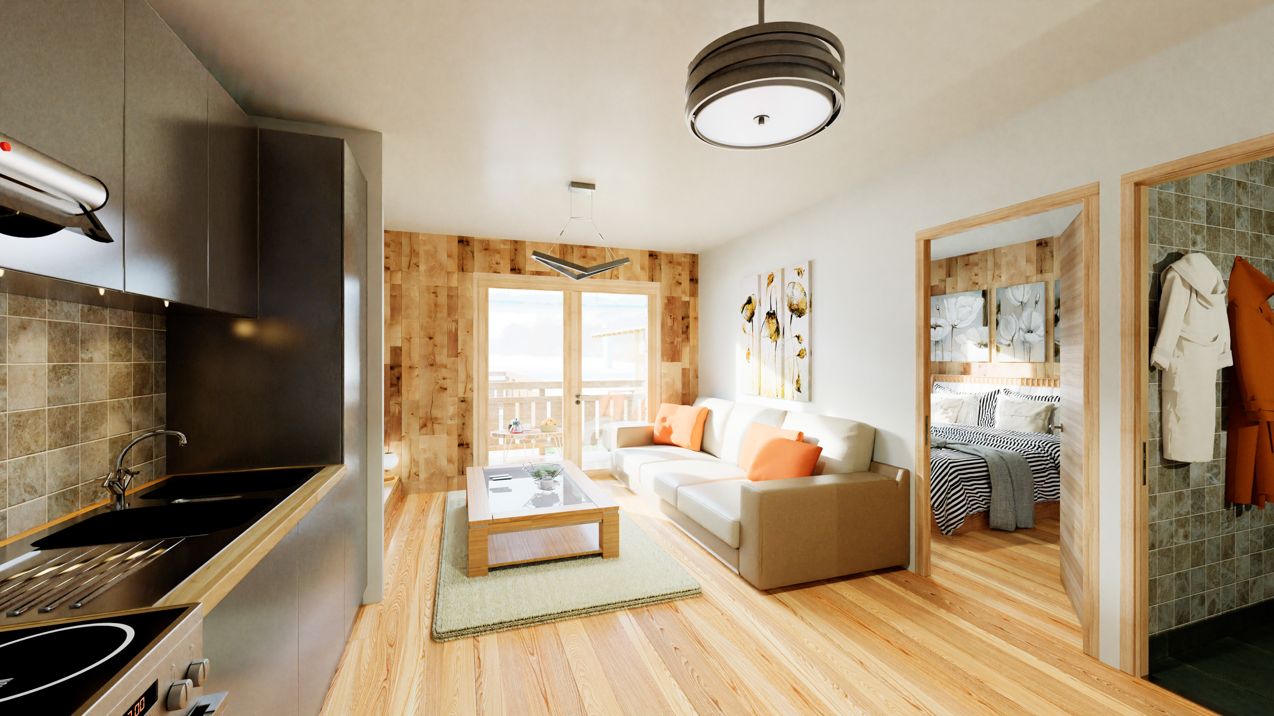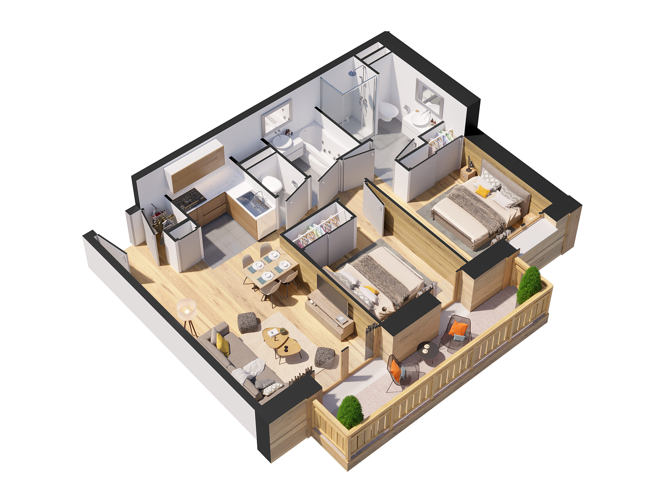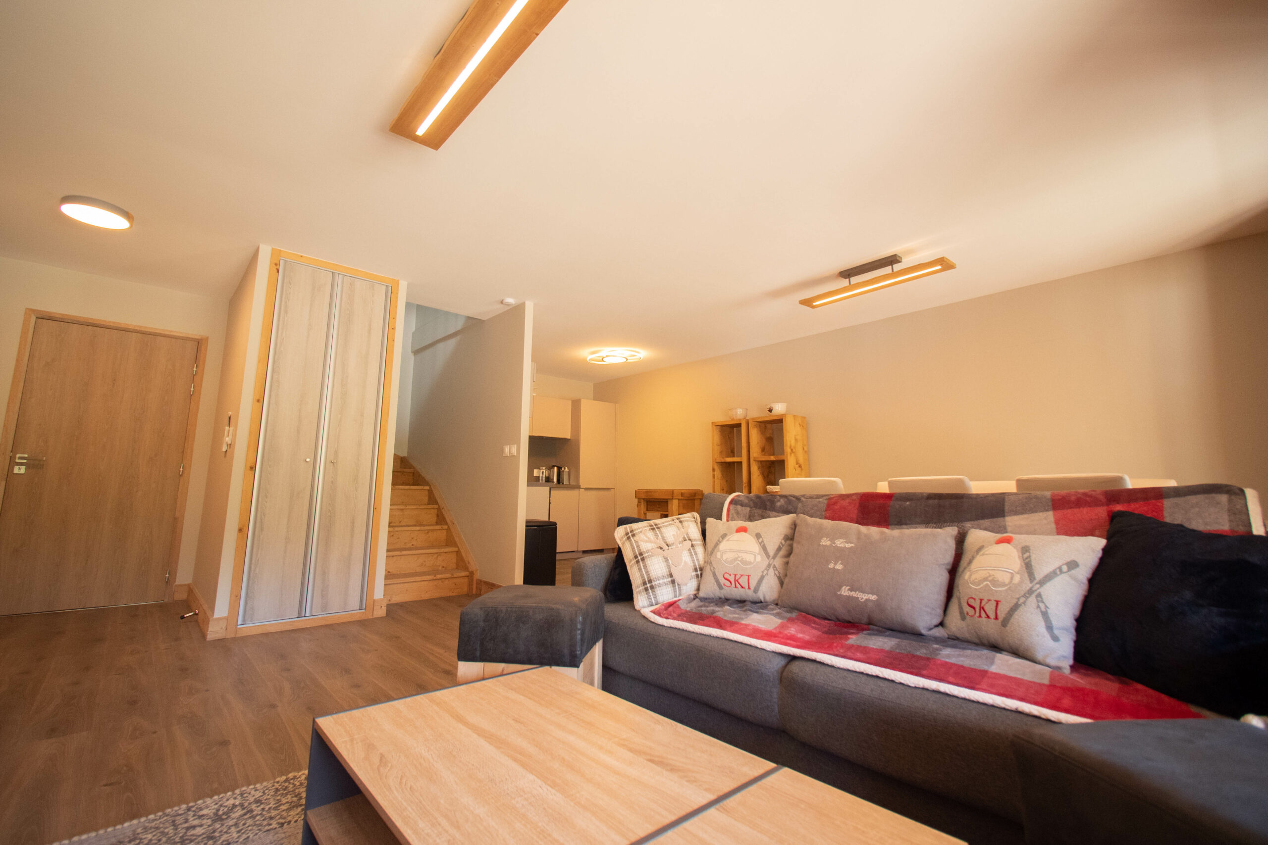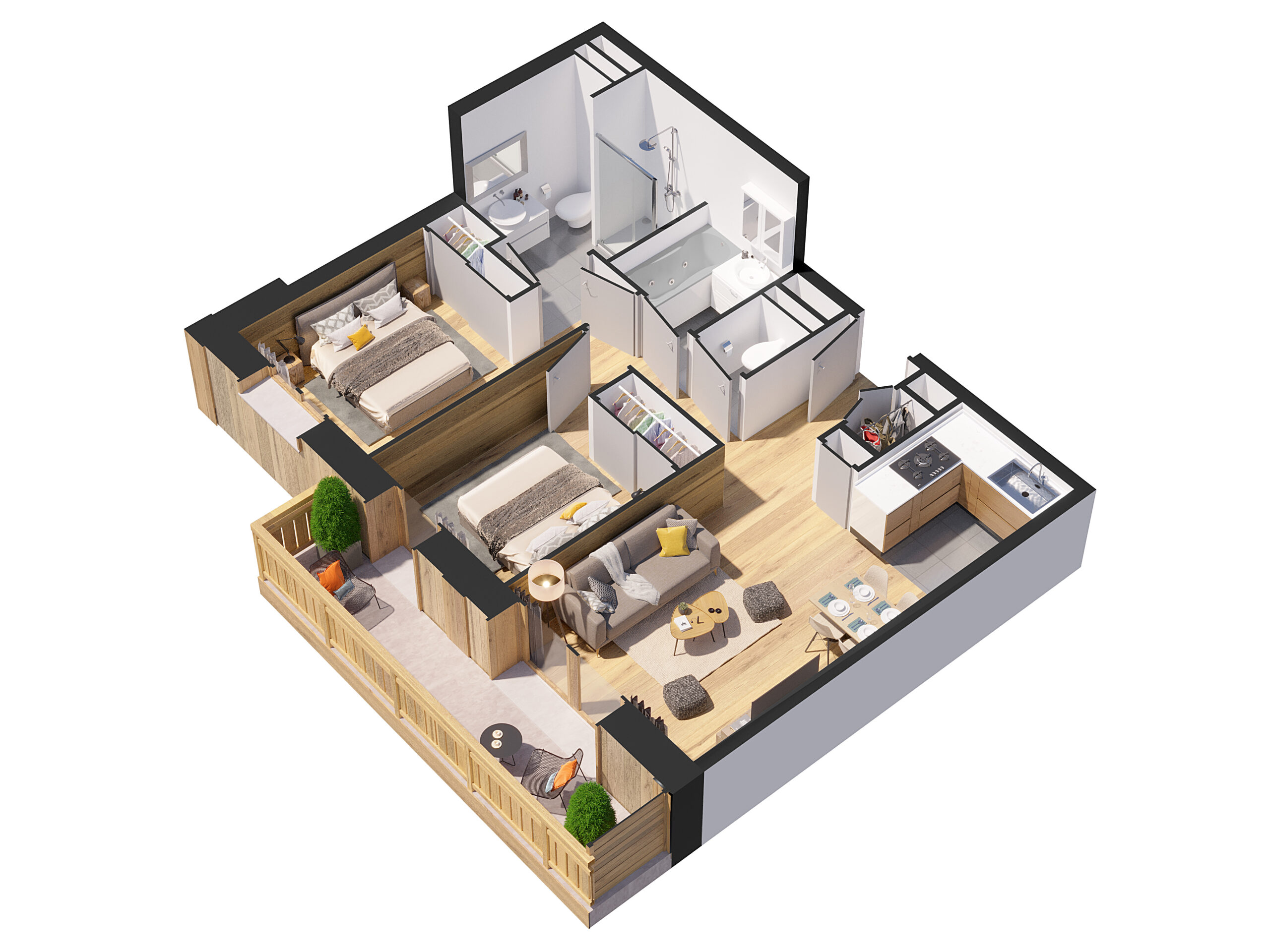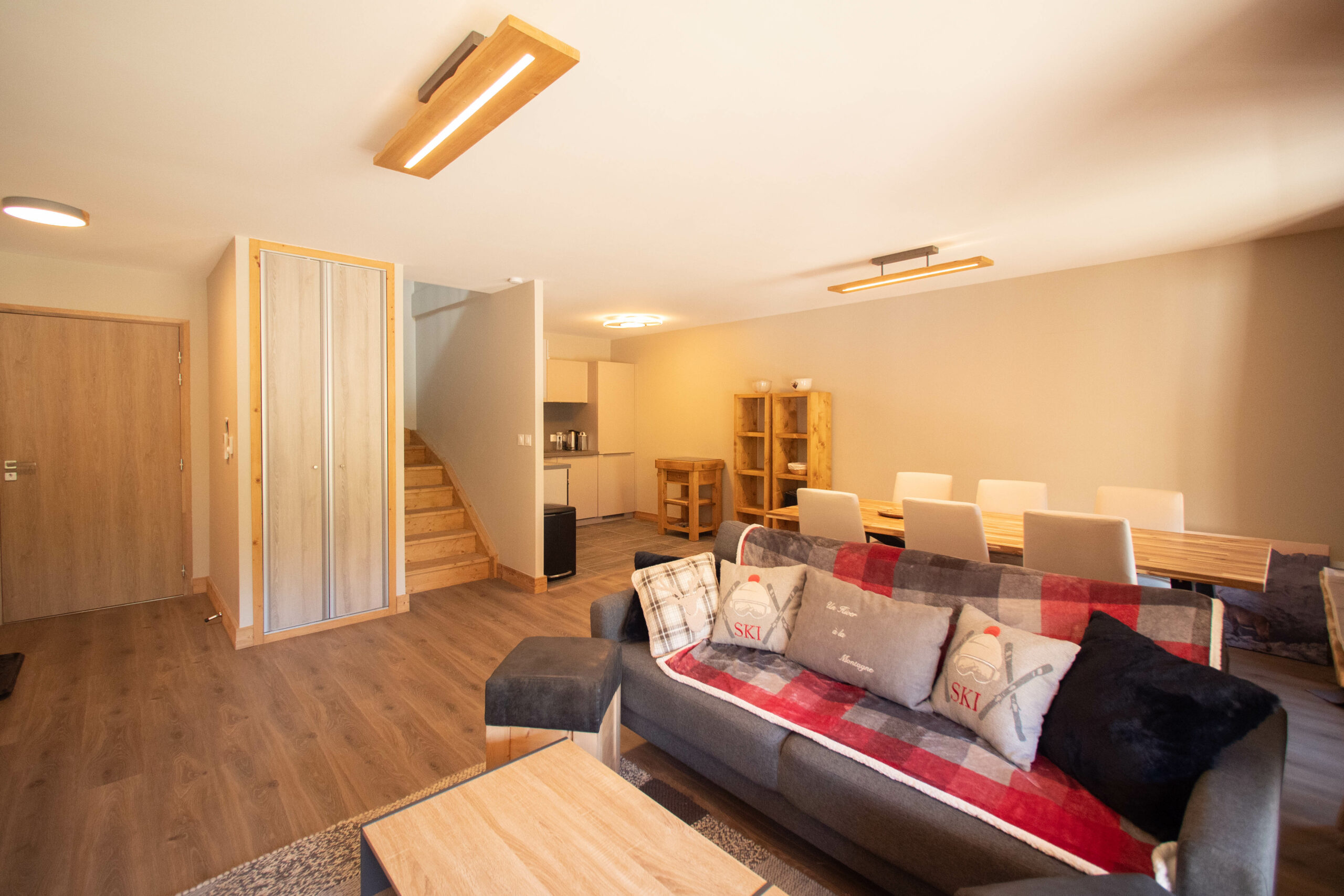 Appartements du 3 Pièces au 5 Pièces Duplex à partir de 579 000 € vendus avec cuisine équipée, cave, ski room et emplacement de stationnement intérieur en sous-sol, accès direct par ascenseur.