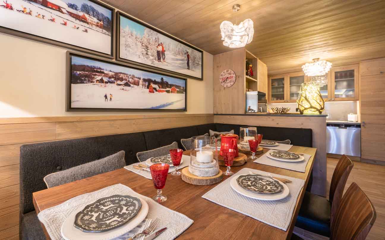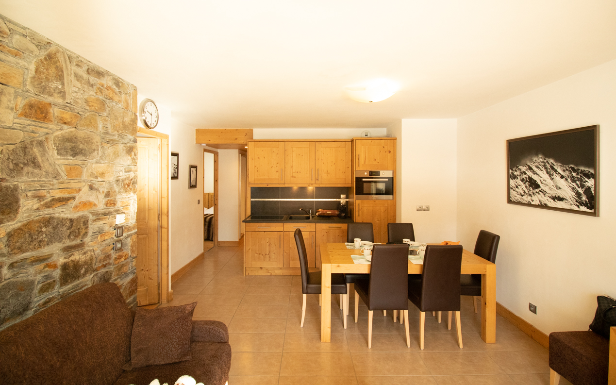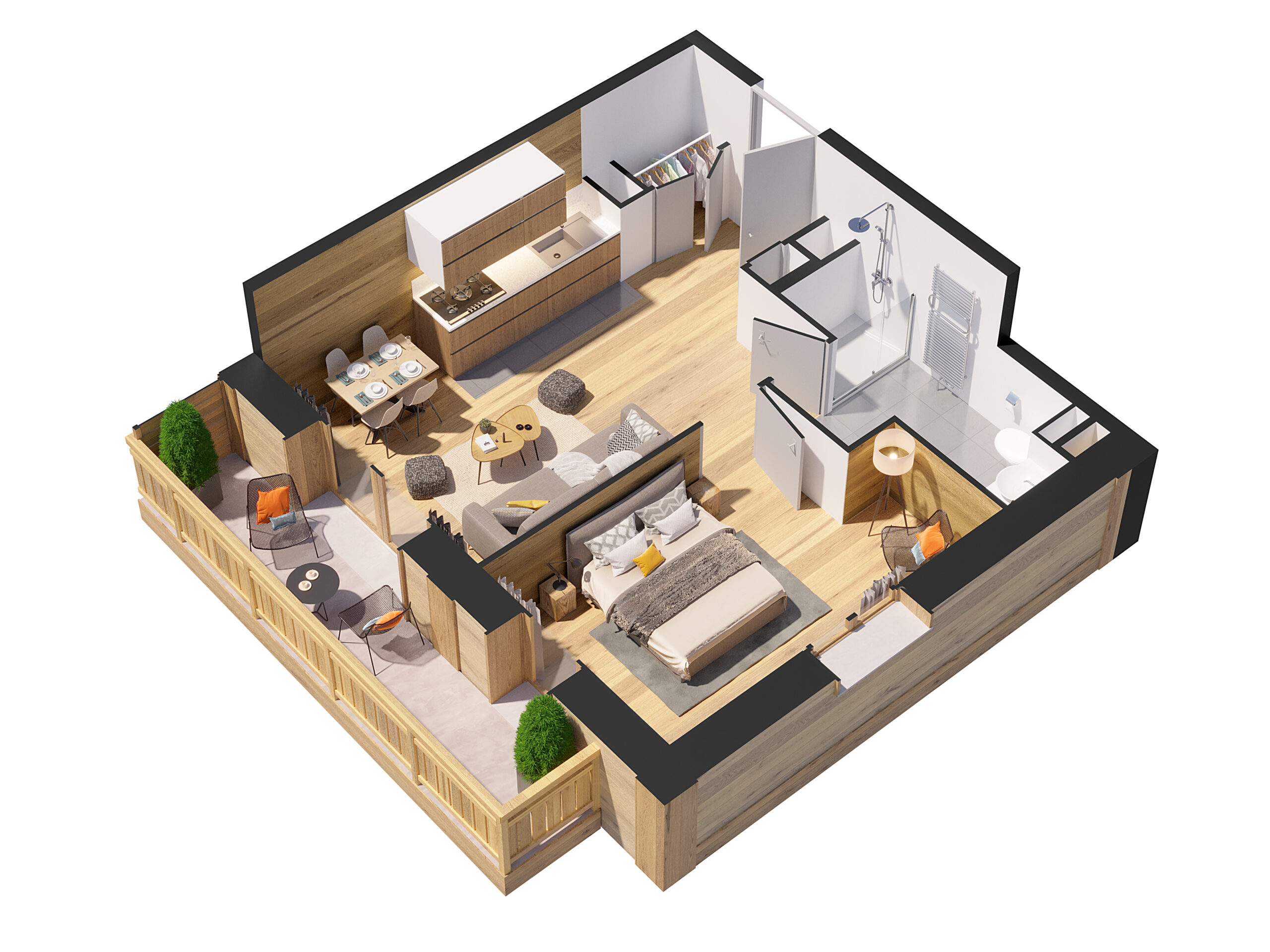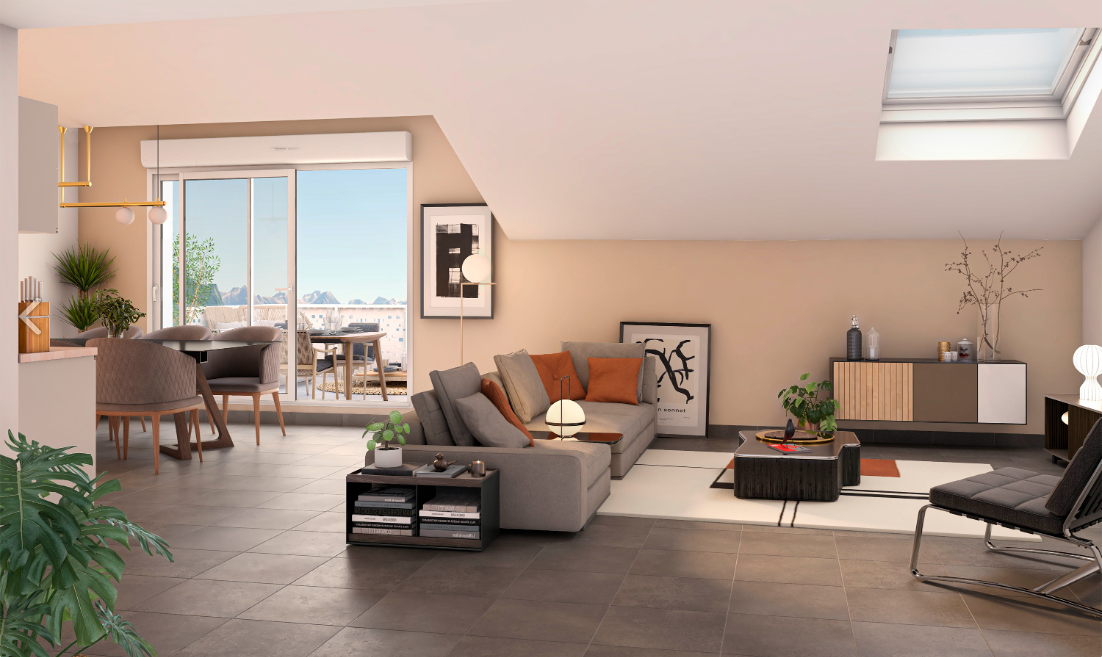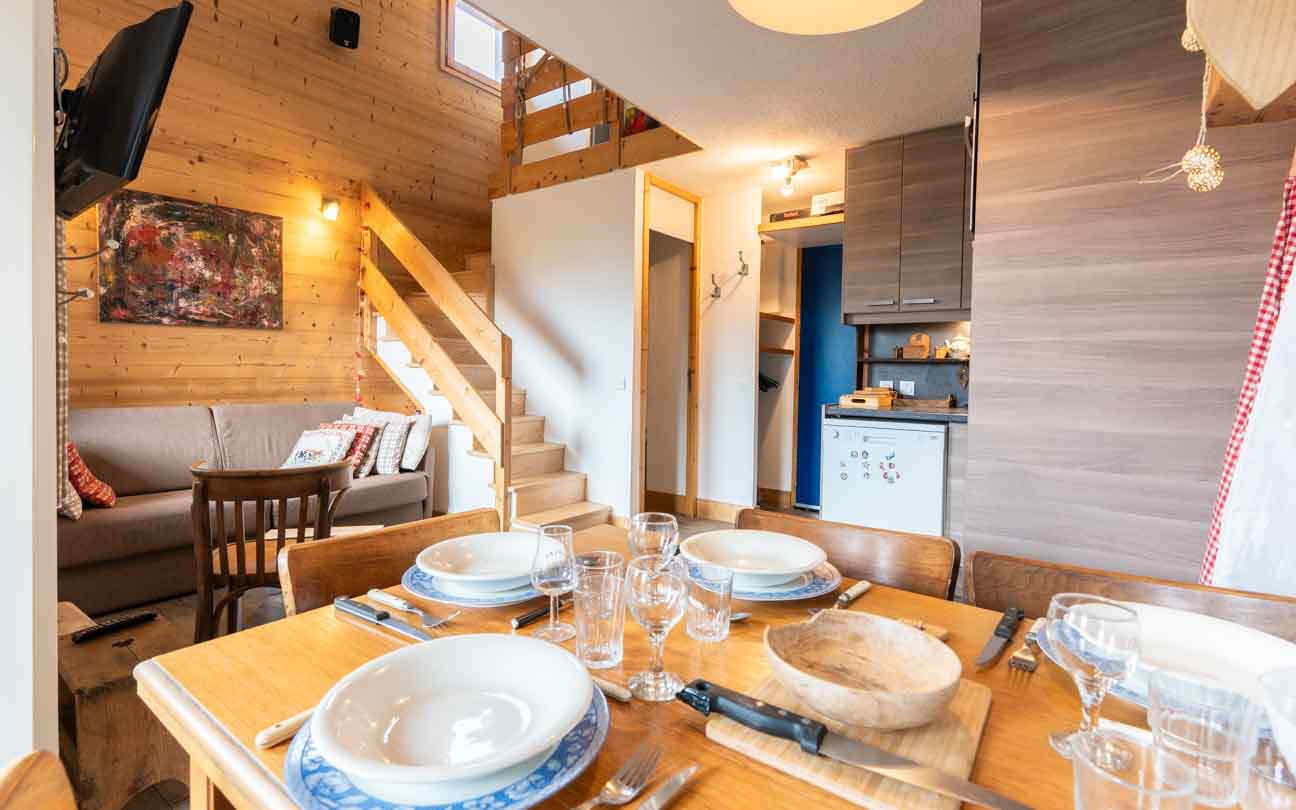 Appartements du 3 Pièces au 5 Pièces Duplex à partir de 579 000 € vendus avec cuisine équipée, cave, ski room et emplacement de stationnement intérieur en sous-sol, accès direct par ascenseur.