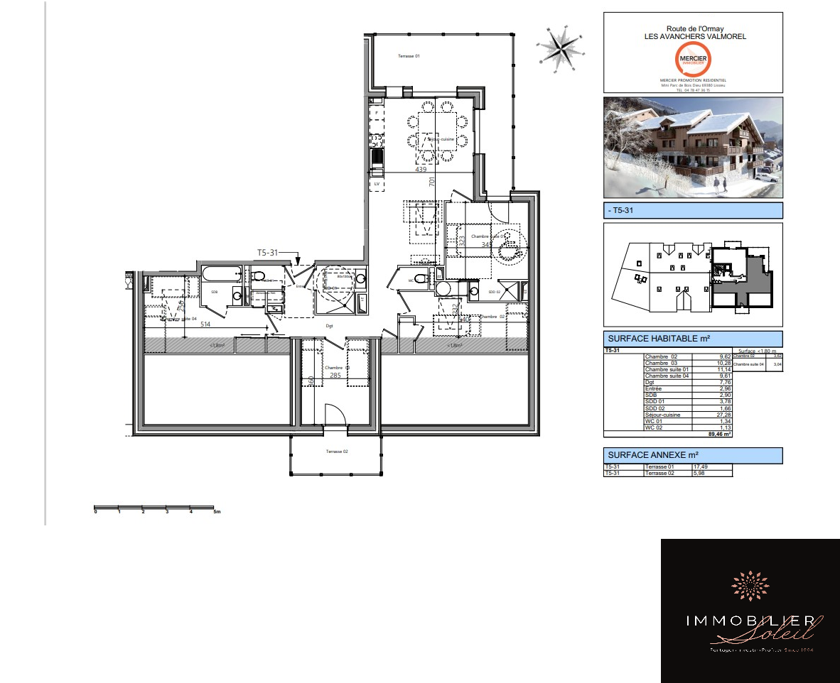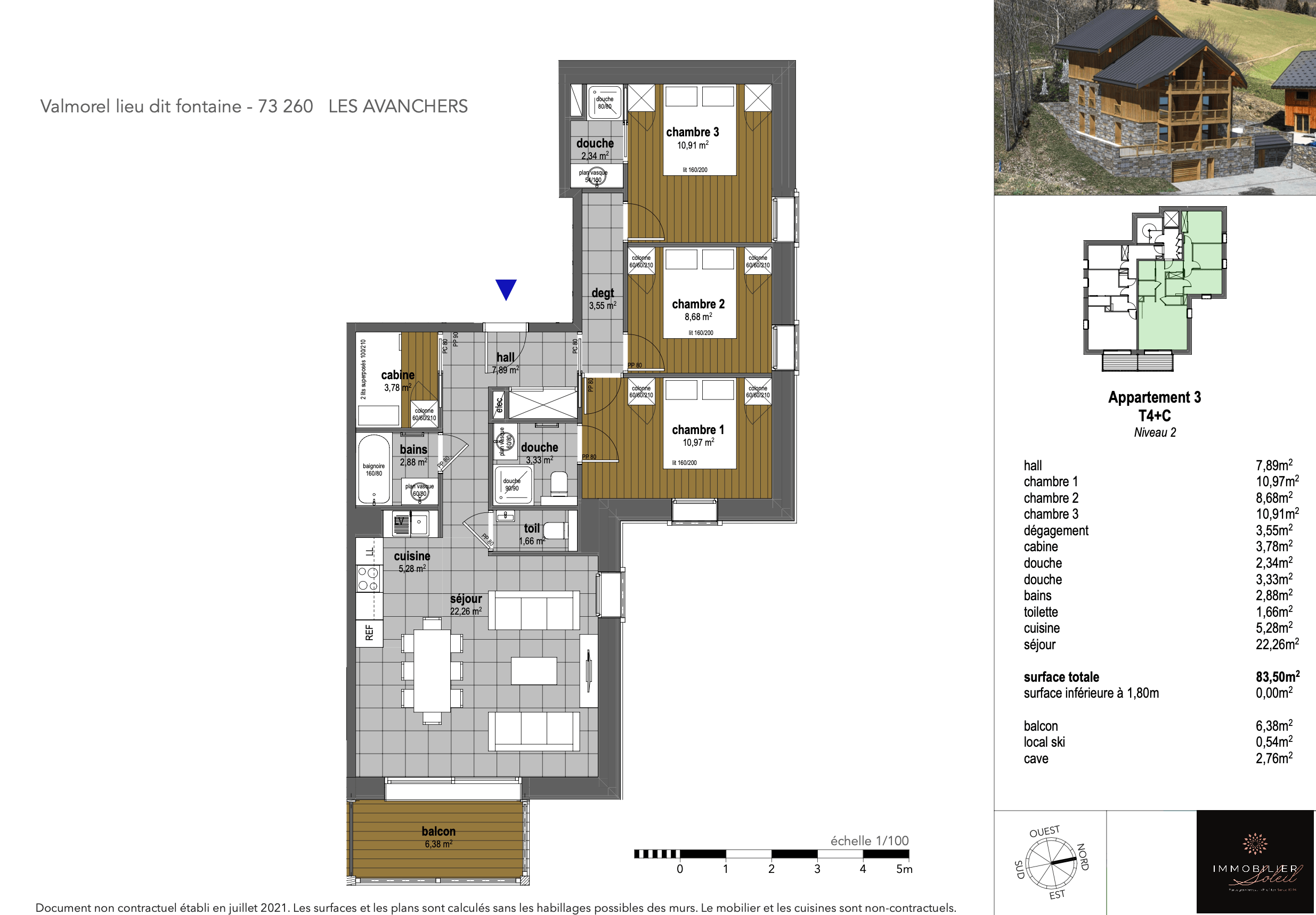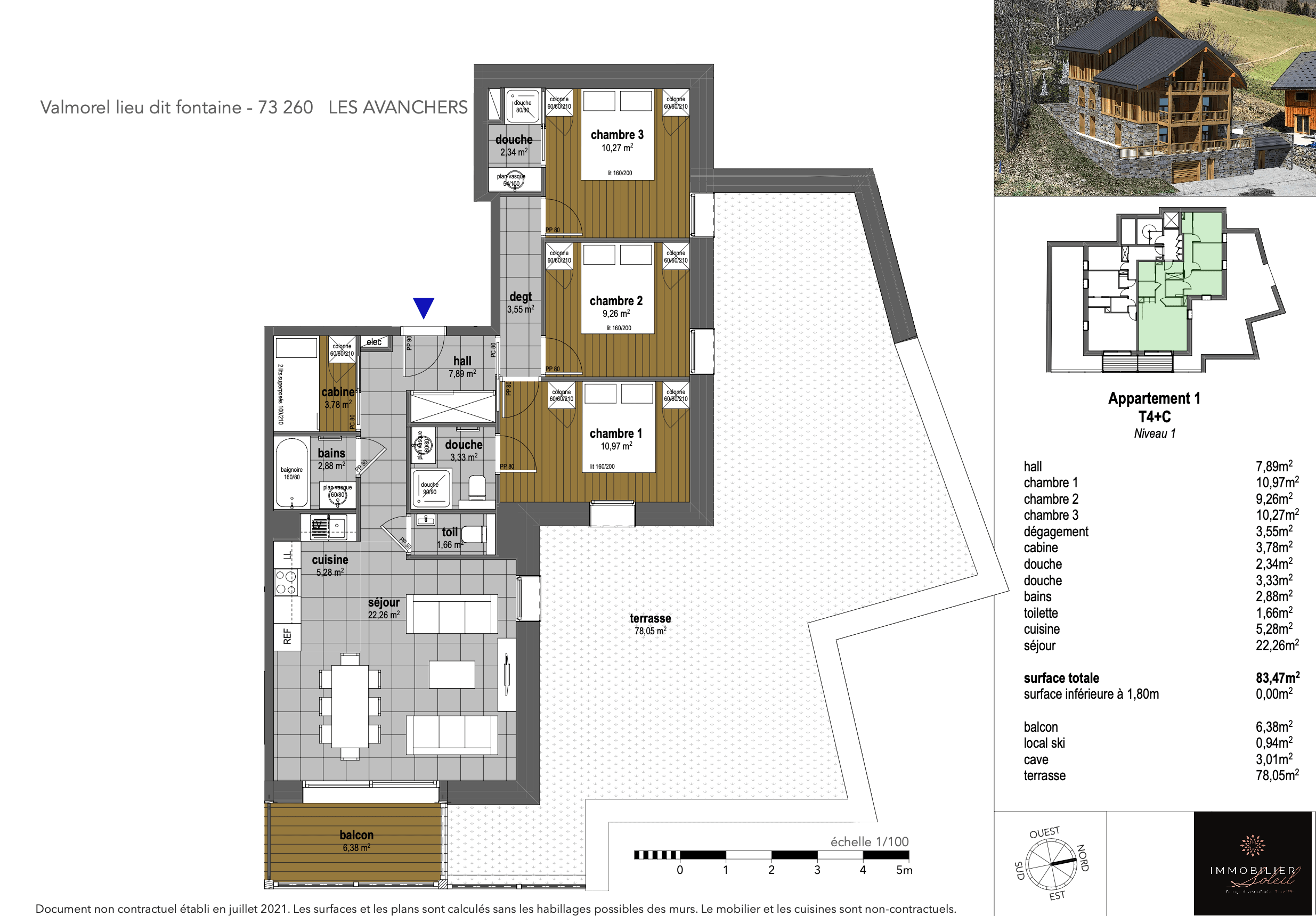 Le "CRISTAL LODGES" est situé au pied de la piste et télésiège des Lanchettes, accès par l'impasse des "Planchettes", aucun trafique devant votre résidence, 200m de l’arrêt navette VALMOBUS et 10 minutes à pied de la rue du Bourg Morel. Appartement n°1, T4+cabine, 3 chambres dont 2 ensuite, cabine, 2 salle d'eau, 1 salle de bains, balcon 10m²71, terrasse 38m²23, vendu avec cave, casier à skis et 2 emplacements de stationnement en sous-sol, vendu au prix de 879 000€, programme éligible la récupération de TVA. Bénéficiez des avantages du neuf : frais de notaire et droits d'enregistrement réduits, isolation thermique et phonique performante, garanties sur la construction. Production d’eau chaude et chauffage par chaudières collective à gaz, comptage individuel par sous compteur calorifique pour le chauffage et consommation pour l’eau chaude sanitaire, chauffage par chauffage au sol (dimension et positionnement selon étude thermique