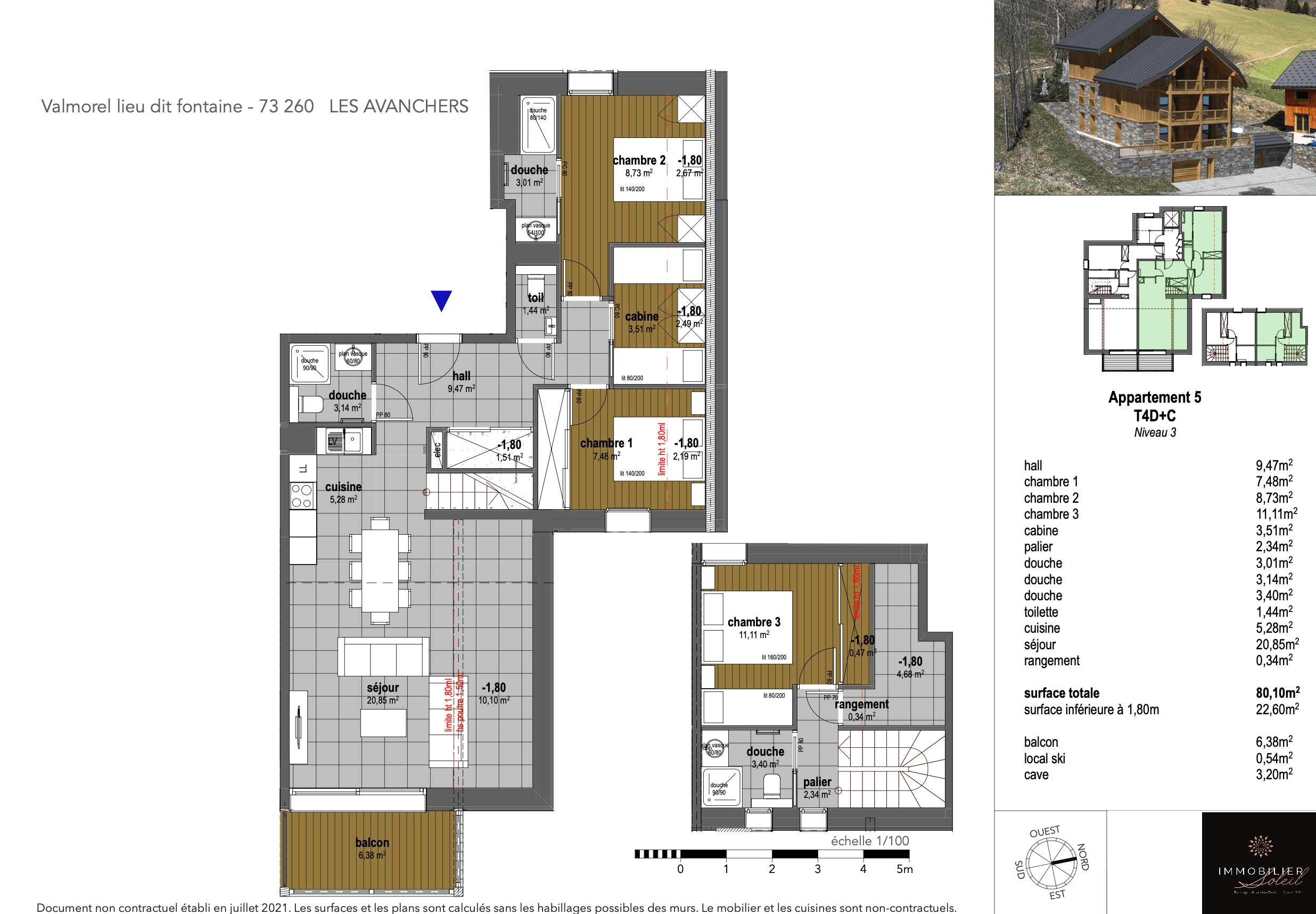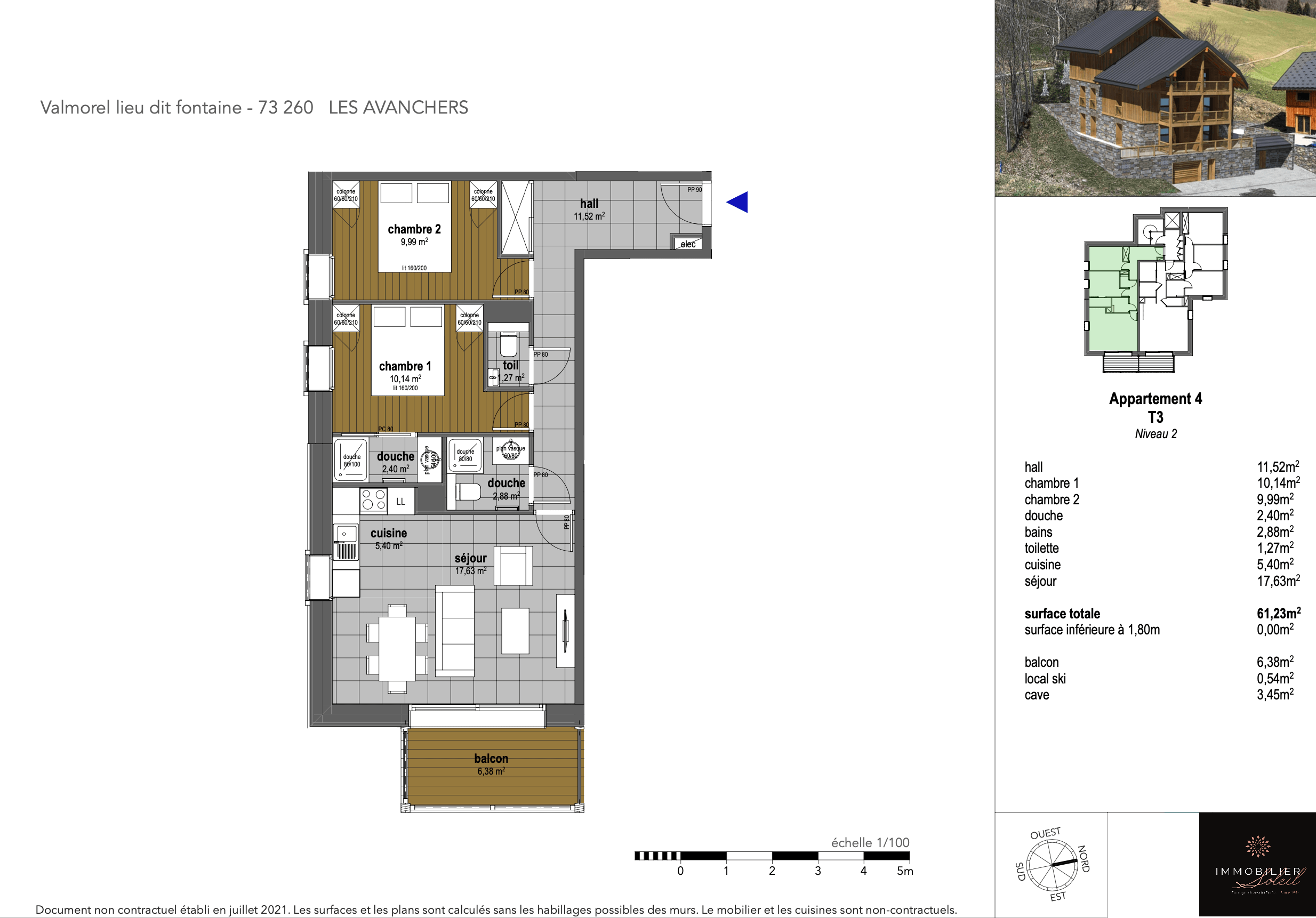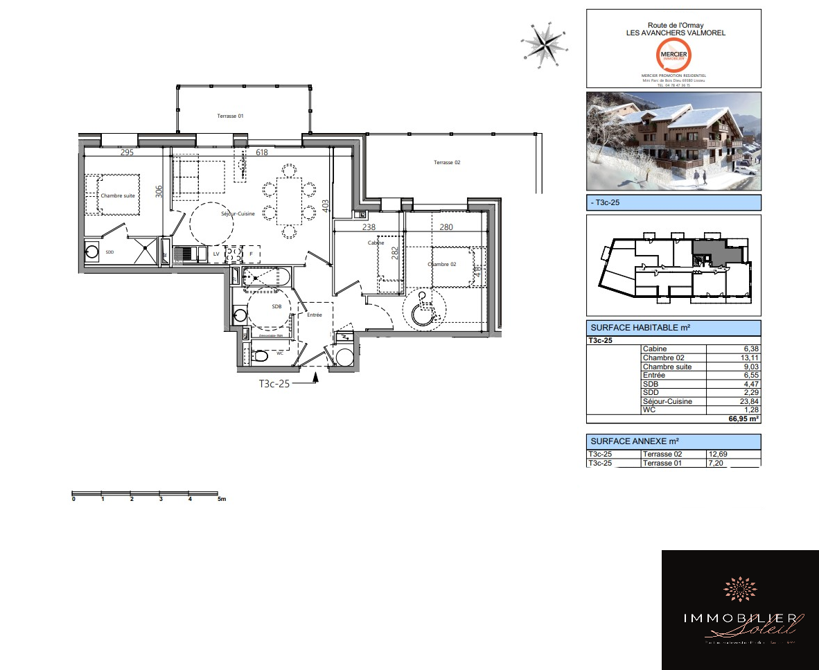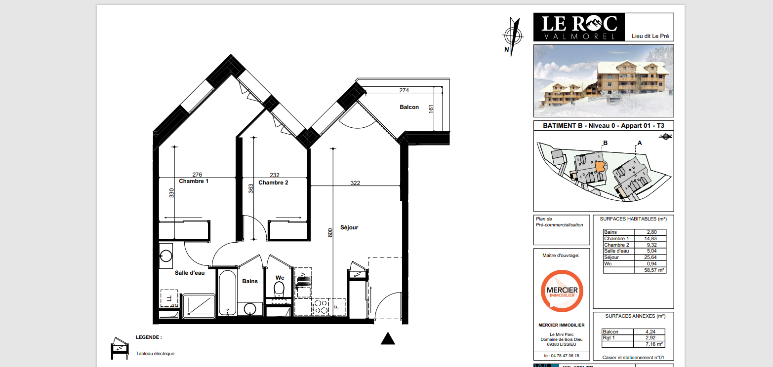 Le "CRISTAL LODGES" est situé au pied de la piste et télésiège des Lanchettes, accès par l'impasse des "Planchettes", aucun trafique devant votre résidence, 200m de l’arrêt navette VALMOBUS et 10 minutes à pied de la rue du Bourg Morel. Appartement n°1, T4+cabine, 3 chambres dont 2 ensuite, cabine, 2 salle d'eau, 1 salle de bains, balcon 10m²71, terrasse 38m²23, vendu avec cave, casier à skis et 2 emplacements de stationnement en sous-sol, vendu au prix de 879 000€, programme éligible la récupération de TVA. Bénéficiez des avantages du neuf : frais de notaire et droits d'enregistrement réduits, isolation thermique et phonique performante, garanties sur la construction. Production d’eau chaude et chauffage par chaudières collective à gaz, comptage individuel par sous compteur calorifique pour le chauffage et consommation pour l’eau chaude sanitaire, chauffage par chauffage au sol (dimension et positionnement selon étude thermique