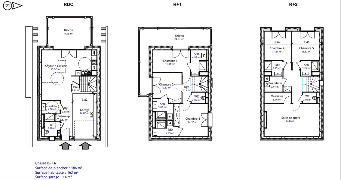 Surface de plancher : 186 m² Surface habitable : 163 m² Surface garage : 14 m² Surface Balcons : 41 m²
